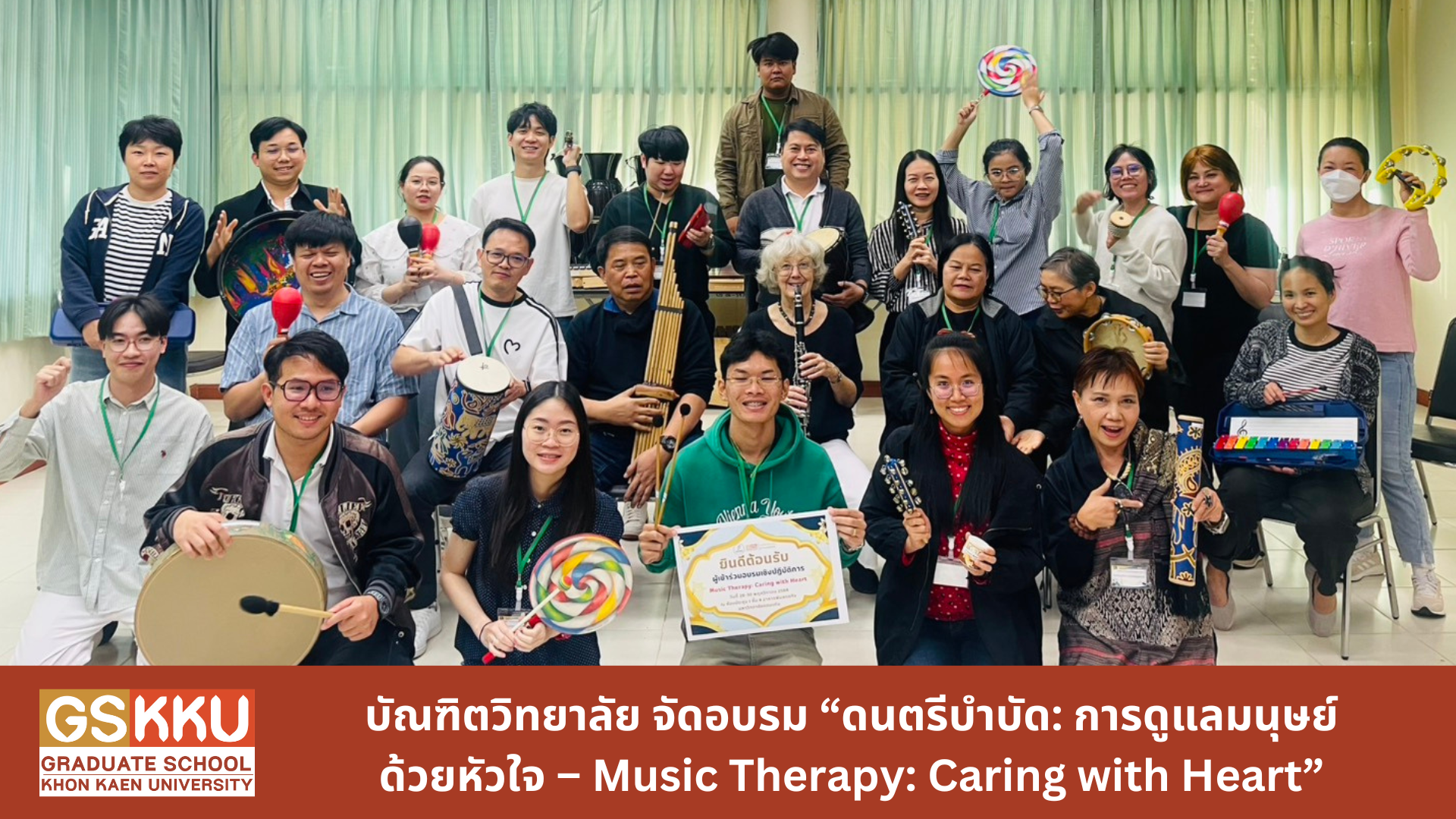 บัณฑิตวิทยาลัย มหาวิทยาลัยขอนแก่น จัดอบรมเชิงปฏิบัติการ "ดนตรีบำบัด: การดูแลมนุษย์ด้วยหัวใจ – Music Therapy: Caring with Heart" ระหว่างวันที่ 29-30 พฤศจิกายน พ.ศ. 2568 ณ ห้องประชุม 1 ชั้น 4 บัณฑิตวิทยาลัย โดยได้รับเกียรติจาก Professor Dr. Amelia Oldfield นักดนตรีบำบัดและนักวิจัยชื่อดังระดับนานาชาติจากสหราชอาณาจักร ร่วมกับทีมวิทยากรผู้เชี่ยวชาญด้านดนตรีบำบัดของไทย ได้บรรยาย ถ่ายทอดประสบการณ์ และสาธิตการปฏิบัติงาน ผู้เข้าร่วมอบรมกว่า 30 คน จากหลายสาขาวิชาชีพ ทั้งนักกายภาพบำบัด ผู้ดูแลผู้สูงอายุ นักกิจกรรมบำบัด ครูการศึกษาพิเศษ และบุคลากรด้านสุขภาพ