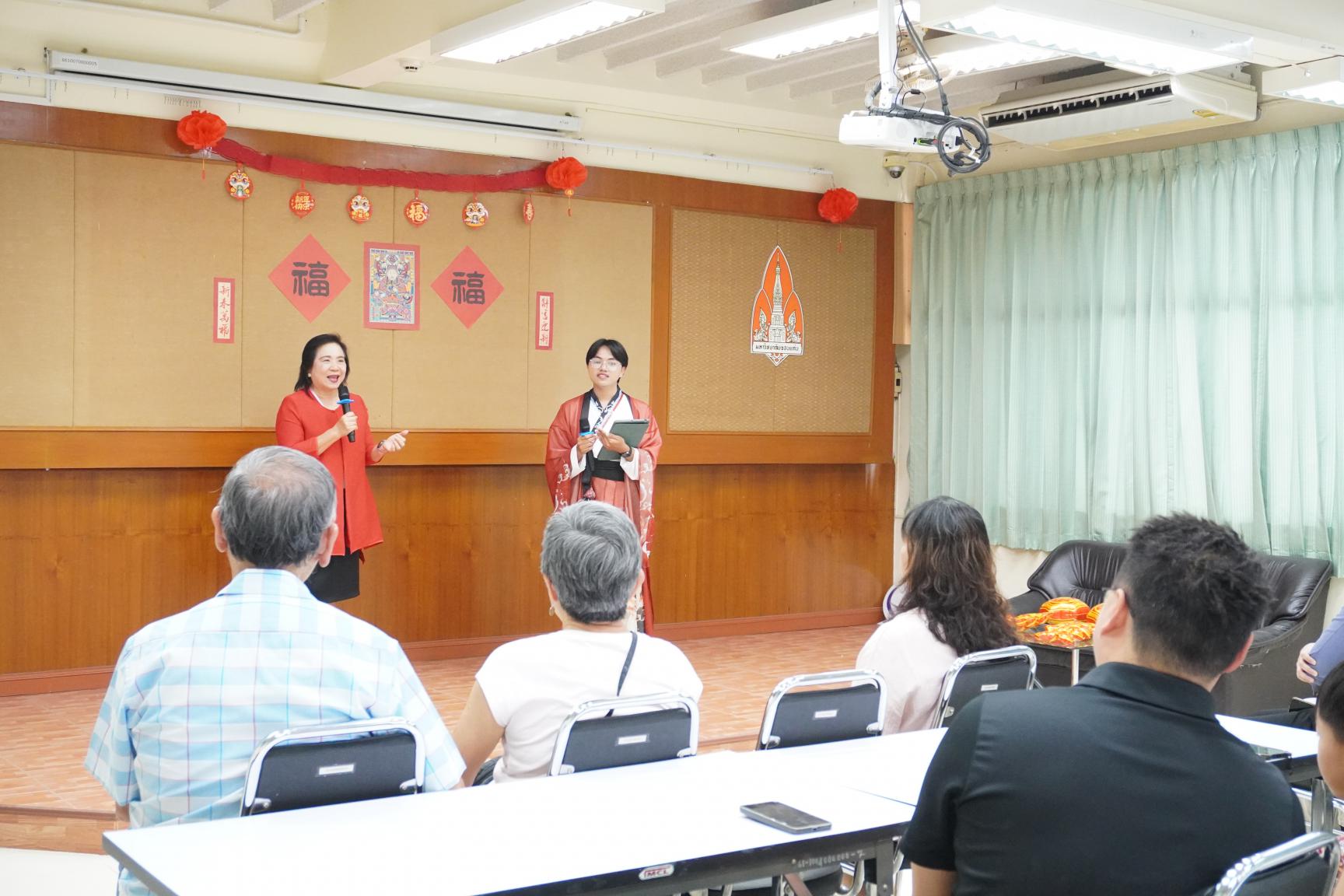 รศ.ดร.อภิวันท์ มนิมนากร ที่ปรึกษาหัวหน้าสาขาวิชาร่วม บัณฑิตวิทยาลัยและกรรมการบริหารหลักสูตรสาขาวิชาวิทยาศาสตร์การออกกำลังกายและการกีฬา และคณาจารย์ ศ.ดร.วิชัย อึงพินิจพงศ์ ศ.ดร.เบญมาศ พระธานี อ.ดร. นารีลักษณ์ ตั้งศรีศักดา กล่าวต้อนรับ และอวยพรแก่ผู้เข้าร่วมงาน กิจกรรมช่วงแรกเป็นการแสดงศิลปวัฒนธรรมจีนที่สะท้อนถึงความเชื่อและปรัชญาชีวิตในเทศกาลตรุษจีน ได้แก่ การเปิดงานด้วยการแสดง "Ascending the Spring Mountains" " ซึ่งเป็นสัญลักษณ์แห่งการต้อนรับฤดูใบไม้ผลิและความเจริญรุ่งเรือง การแสดงรำพื้นบ้าน "Colored Clouds Chasing the Moon" เปรียบเป็นความสุขและความหวังดีที่คนในครอบครัวมีต่อกัน การสาธิตศิลปะการต่อสู้ไทเก๊กที่แสดงถึงความแข็งแกร่งและสมดุลของร่างกายจิตใจ การจัดแสดงการเขียนพู่กันจีน เป็นการเขียนข้อความอวยพรบนกระดาษสีแดงเพื่อนำความมงคลมาสู่บ้าน การแสดงเครื่องดนตรีจีนดั้งเดิมที่สร้างบรรยากาศแห่งความสุขสันต์ และกิจกรรมตอบคำถามความรู้เกี่ยวกับเทศกาลตรุษจีนเพื่อส่งเสริมความเข้าใจในประเพณีอันดีงาม