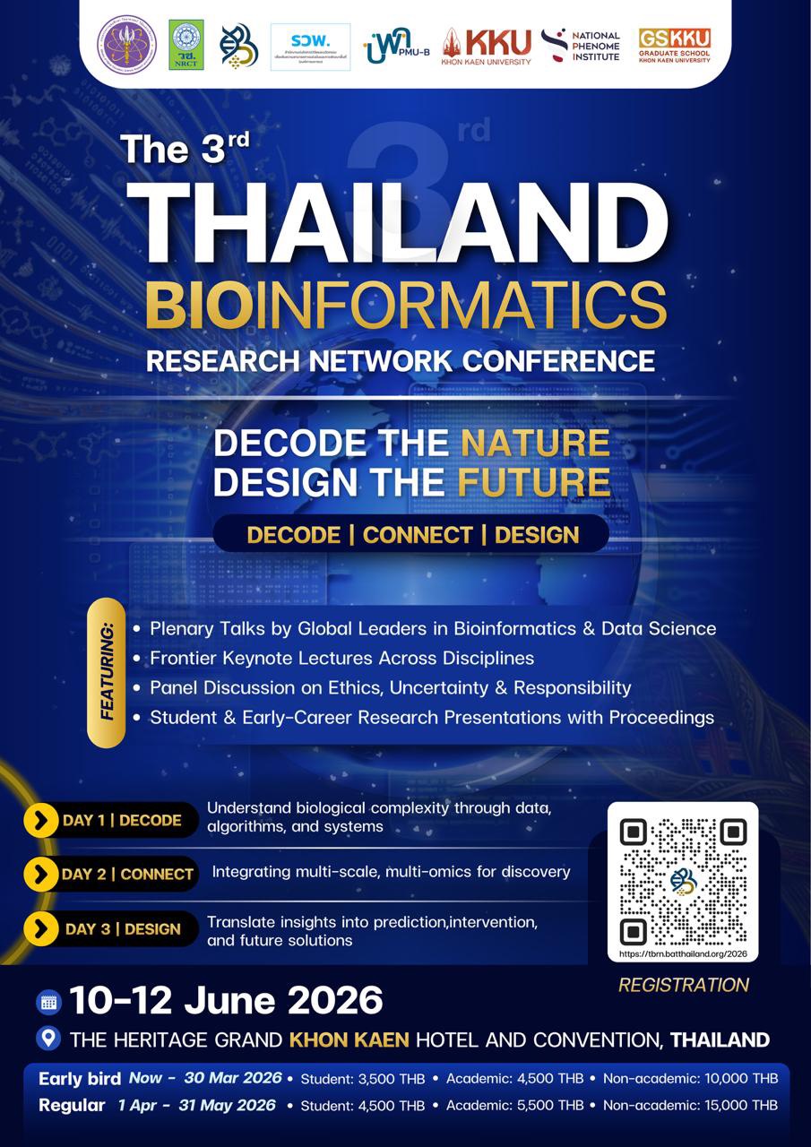 ขอเชิญนักวิจัย นักวิชาการ นักศึกษา และผู้สนใจด้าน Bioinformatics, ML และ Data Scienceร่วมเป็นส่วนหนึ่งของThe 3rd Thailand Bioinformatics Research Network Conference 2026