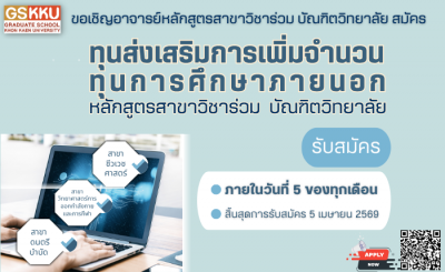 ประกาศ : ทุนส่งเสริมการรับเข้าศึกษาต่อระดับบัณฑิตศึกษา(ภายใต้โครงการส่งเสริมการรับเข้าศึกษาต่อ หลักสูตรสาขาวิชาร่วม บัณฑิตวิทยาลัย ภาคการศึกษาต้น ปีการศึกษา 2569)
